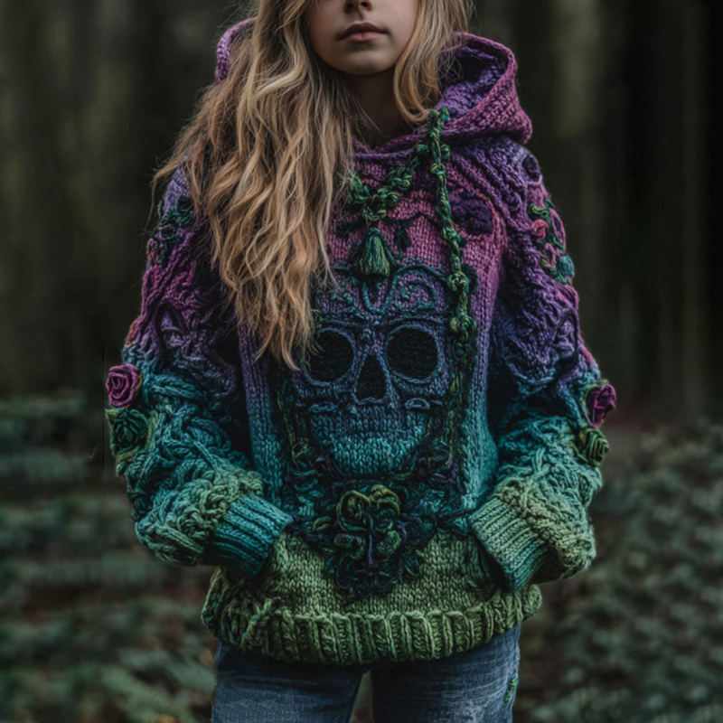 Women's Vintage Viking Skull Gradient Art Knit Hooded Sweater