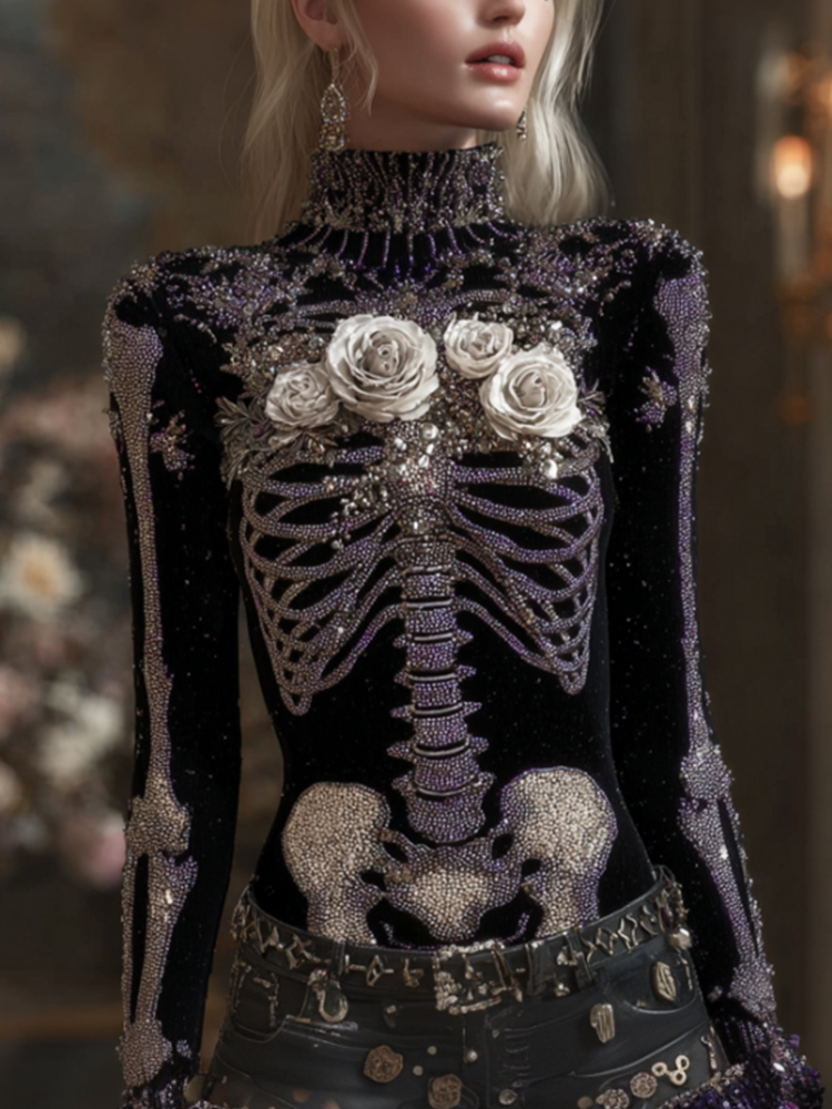 Women Halloween Ancient Skull And Flower High Collar Sweater